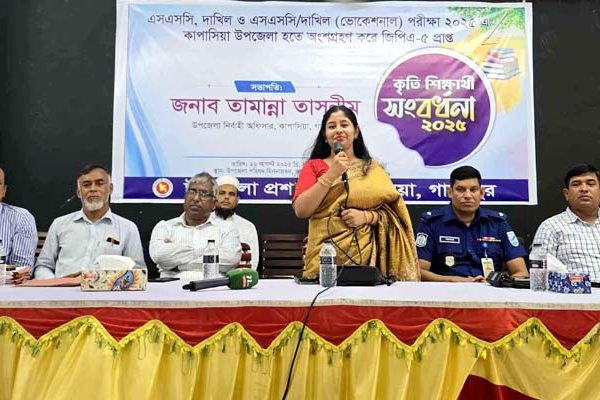 গাজীপুর প্রতিনিধি : গাজীপুরের কাপাসিয়া উপজেলা প্রাশসনের উদ্যোগে জিপিএ-৫ প্রাপ্ত শিক্ষার্থীদের আনুষ্ঠানিকভাবে সংবর্ধনা প্রদান করা হয়েছে। মঙ্গলবার সকালে উপজেলা পরিষদ মিলনায়তনে চলতি ২০২৫ সালে অনুষ্ঠিত এসএসসি, দাখিল ও ভোকেশনাল পরীক্ষায় উপজেলার বিভিন্ন শিক্ষা প্রতিষ্ঠান থেকে জিপিএ-৫ প্রাপ্ত ২’শ ২০ জন কৃতি শিক্ষার্থীদেরকে সংবর্ধনা, সনদ ও ক্রেষ্ট প্রদান করা হয়। উপজেলা নির্বাহী অফিসার (ইউএনও) তামান্না তাসনীমের…